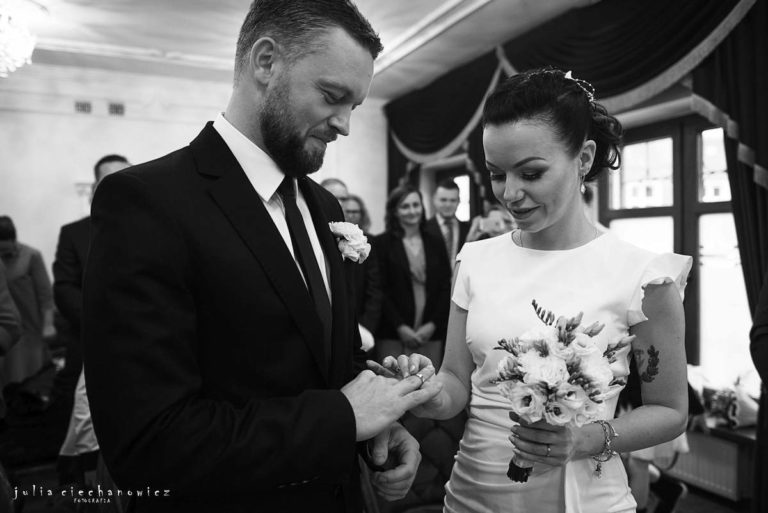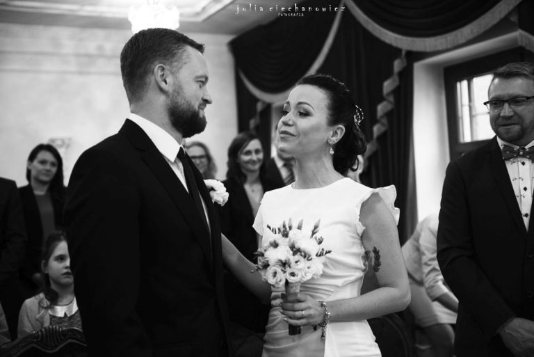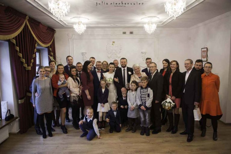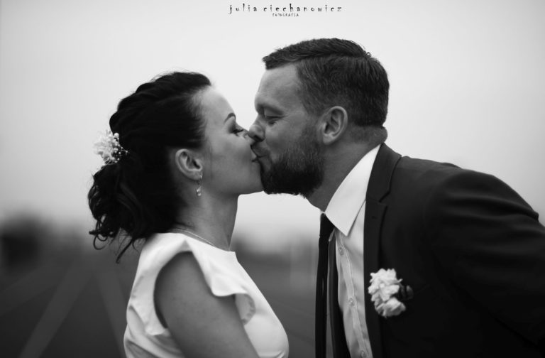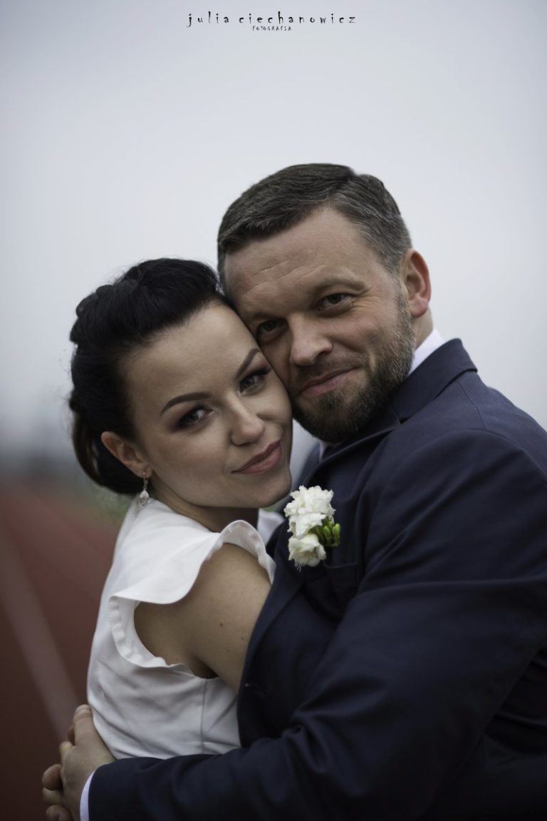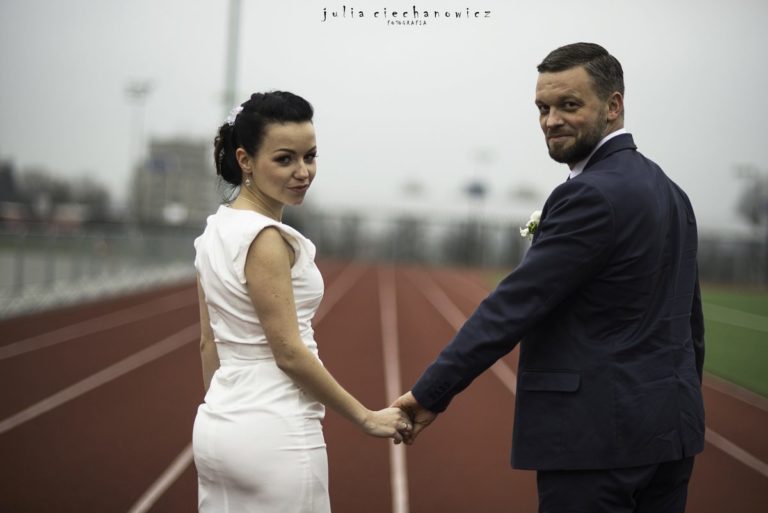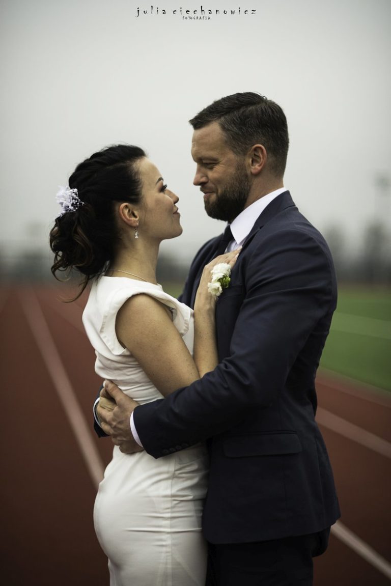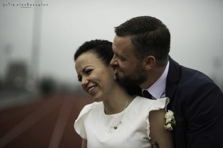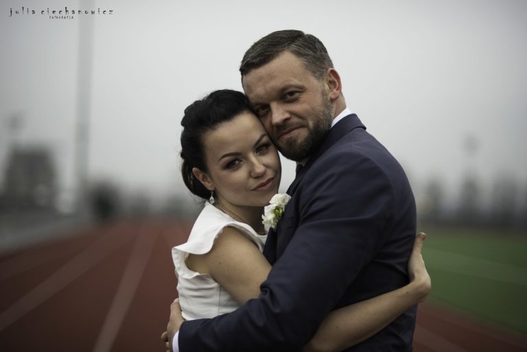 Jagoda i Przemek zaprosili mnie na swój ślub do Strzegomia. Pamiętam datę: 2 grudnia 2017 roku. To była ogromna przyjemność, móc uwiecznić tę wyjątkową chwilę, gdy młodzi wsuwają sobie wzajemnie obrączki na palce i składają tyle pięknych obietnic. Ceremonia zakończyła się wspólnym rodzinnym zdjęciem, a potem już biegliśmy na… stadion.