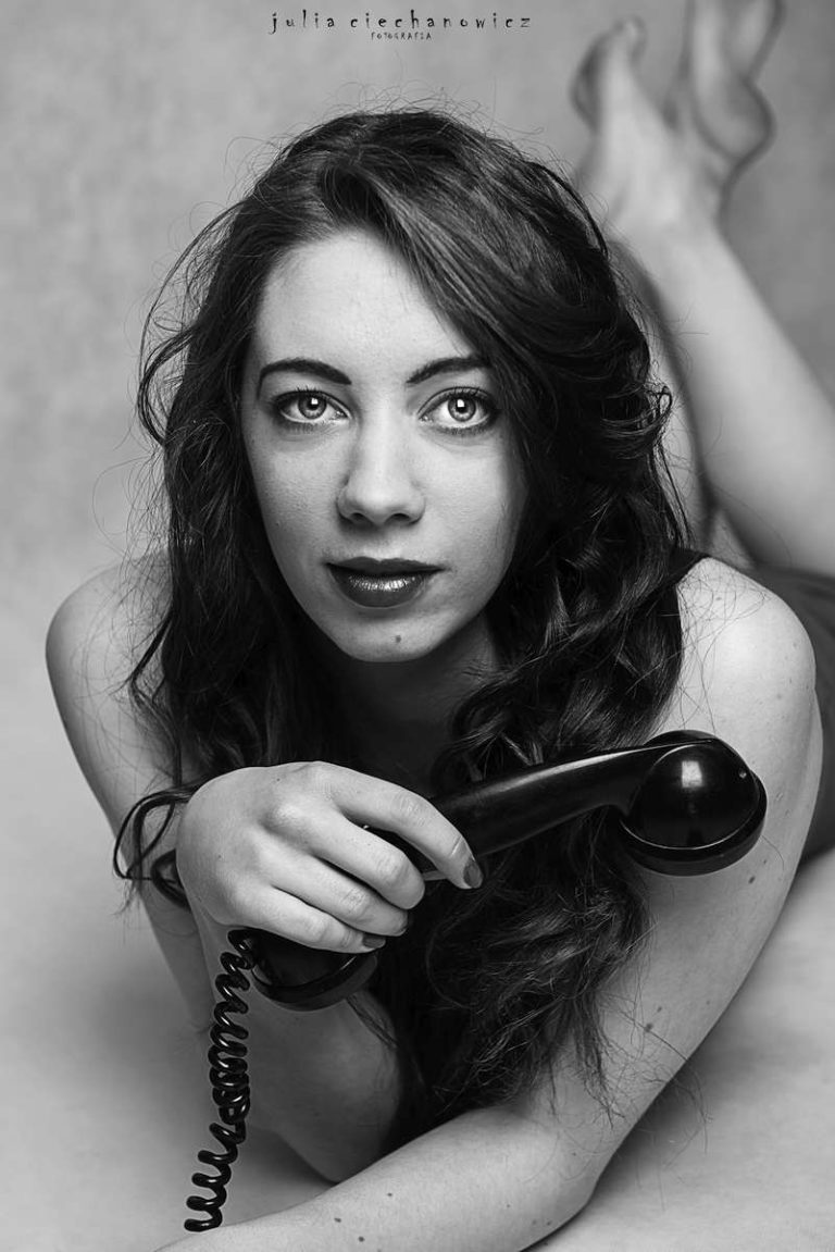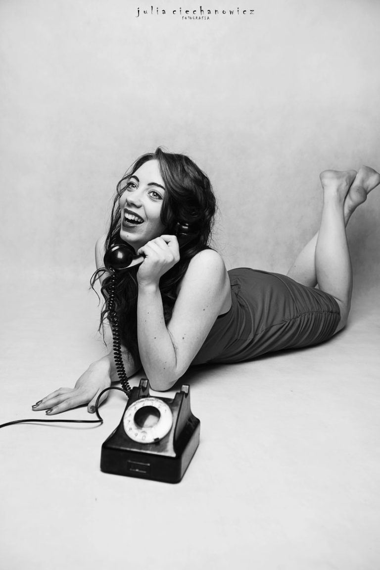 Gdy spojrzałam na Agnieszkę pierwszy raz pomyślałam o Francji, flircie i rozmowach przez telefon. Moja modelka zdecydowała się na sesję studyjną więc dobrałam białe tło i zaproponowałam telefon w stylu retro z okrągłą tarczą do wykręcania numerów.
